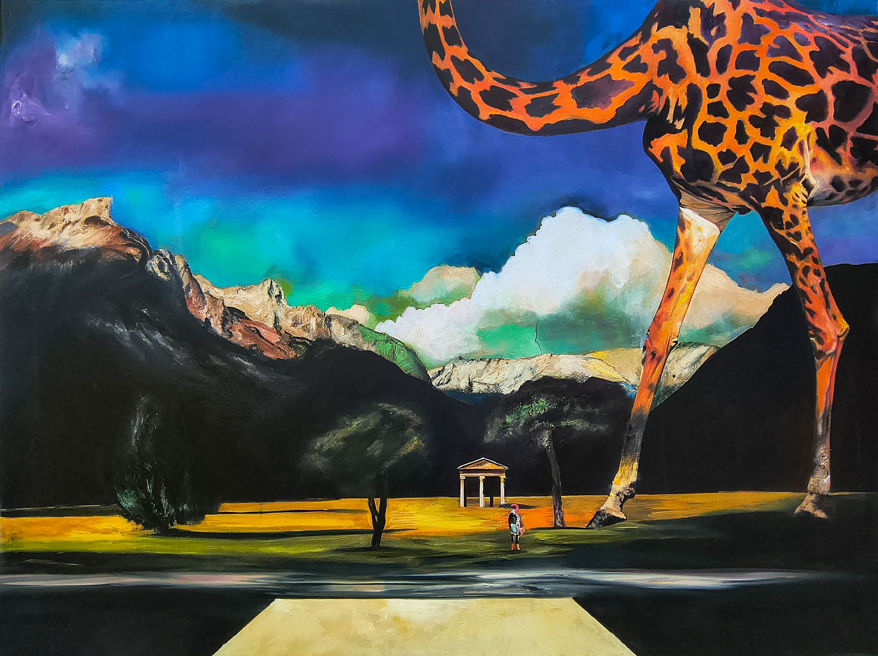 The background, fractured into bold color blocks and cloudy abstraction, mirrors the theme of imbalance. It’s as if the painting is asking: what happens when the familiar loses its proportions? When serenity is staged, and nature becomes decor?