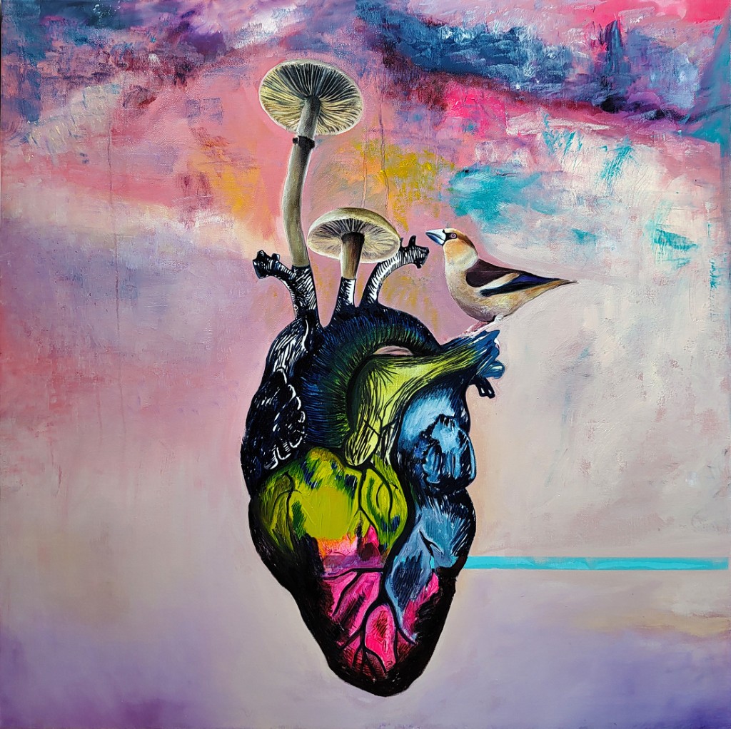 Blue heart pulses with surreal vitality, blending anatomy and nature into a single, living symbol. The heart—rendered in vibrant blues, greens, and pinks—becomes more than a biological organ; it’s a vessel of emotion, growth, and mystery. Mushrooms sprouting from its crown suggest regeneration and the quiet magic of decay, while the bird perched beside it adds a whisper of curiosity, as if nature itself is listening in.