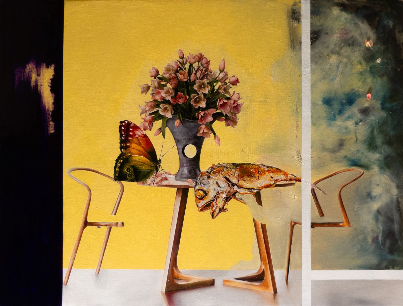 Disproportionate Balance invites the viewer into a world where harmony is deliberately disrupted. The composition juxtaposes delicate natural elements—a butterfly, pink flowers, a fish—with stark geometric divisions and modern furniture, creating a tension between organic beauty and artificial structure. The fish, oddly placed on the table, challenges our expectations and introduces a quiet absurdity, while the butterfly perched beside the vase hints at fleeting grace.