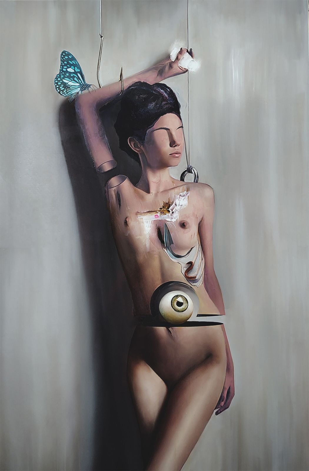 The anatomical and abstract elements painted across the torso suggest a tension between inner truth and external manipulation. The title "plastic" adds a layer of critique, hinting at artificiality, disposability, or the molded nature of identity in modern society.