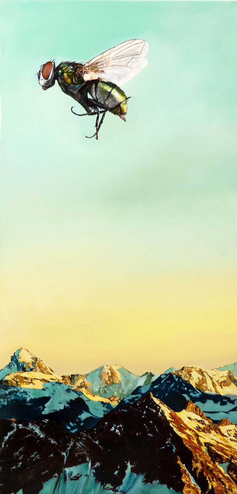 The Pleasing Wonder of Ignorance P3 presents a surreal collision of scale and reality. A colossal fly hovers above a serene range of snow-capped mountains, its presence both absurd and strangely majestic. The delicate gradient of the sky—from cool turquoise to warm gold—suggests the quiet beauty of dawn or dusk, yet the oversized insect disrupts this tranquility, forcing the viewer to question what belongs and what does not.