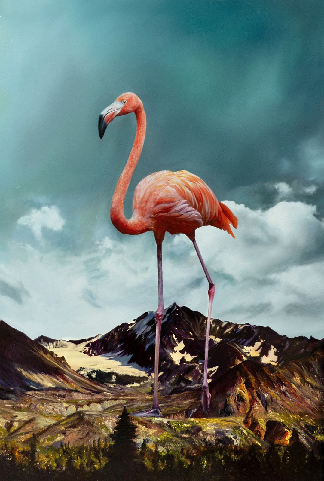 The pleasing wonder of ignorance is a dreamlike meditation on scale, perception, and the blissful detachment from reality. A colossal flamingo towers over a rugged mountain landscape, its soft pink feathers and elegant posture contrasting sharply with the cold, snow-dusted terrain. The surreal proportions evoke a childlike sense of wonder—where logic is suspended and the improbable becomes beautiful.